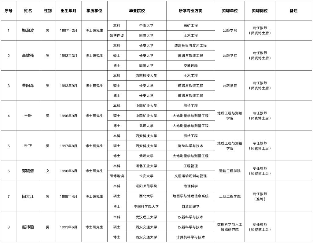 公示时间为2025年12月25日起至2025年12月31日止。公示期间接受社会监督,如有问题反映,请署名以书面形式实事求是地反映问题,并提供必要的证明材料或调查线索,以匿名反映问题的不予受理。拟聘用人员公示结束后,没有反映问题或反映的问题不影响录取的,由长安大学人事处安排参加体检和签订就业协议。